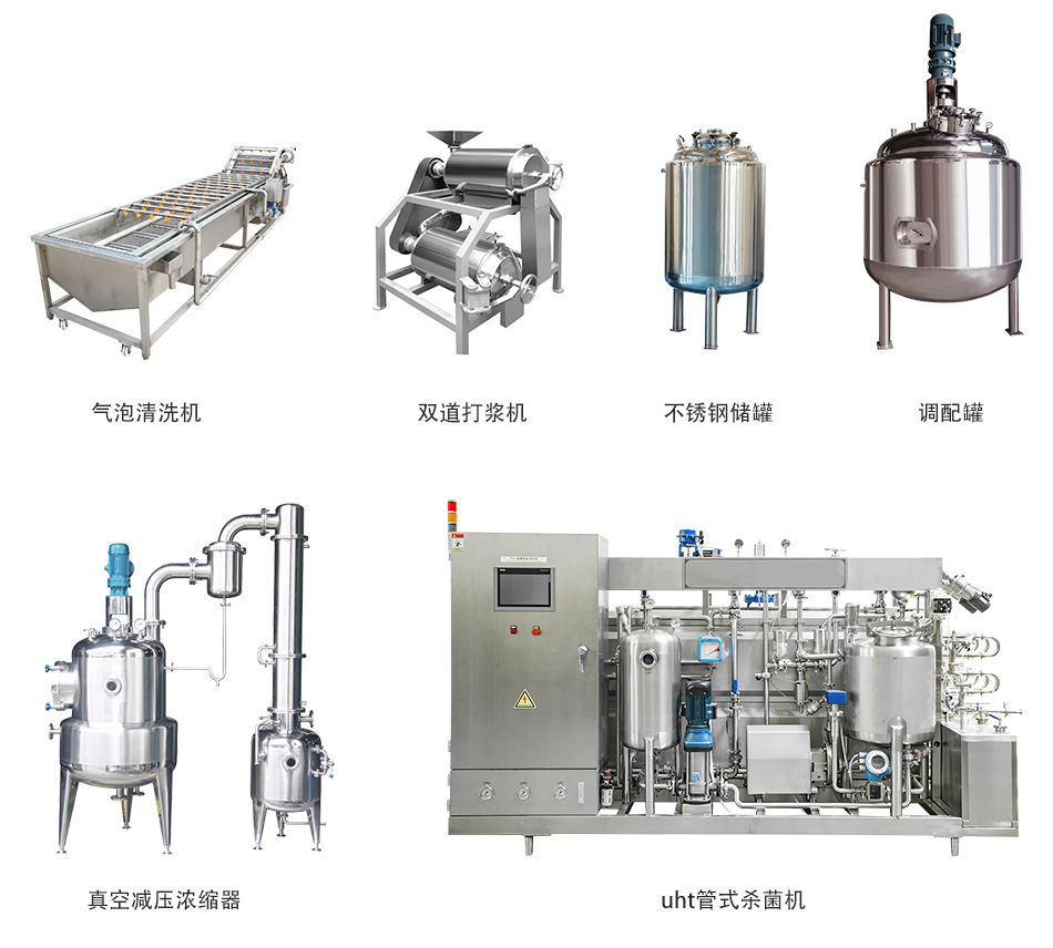 原料→挑選輸送機(jī)→沖浪清洗機(jī)→提升機(jī)→破碎機(jī)→儲(chǔ)罐→打漿機(jī)→調(diào)配罐→帶攪拌真空濃縮鍋→殺菌機(jī)→成品罐→灌裝